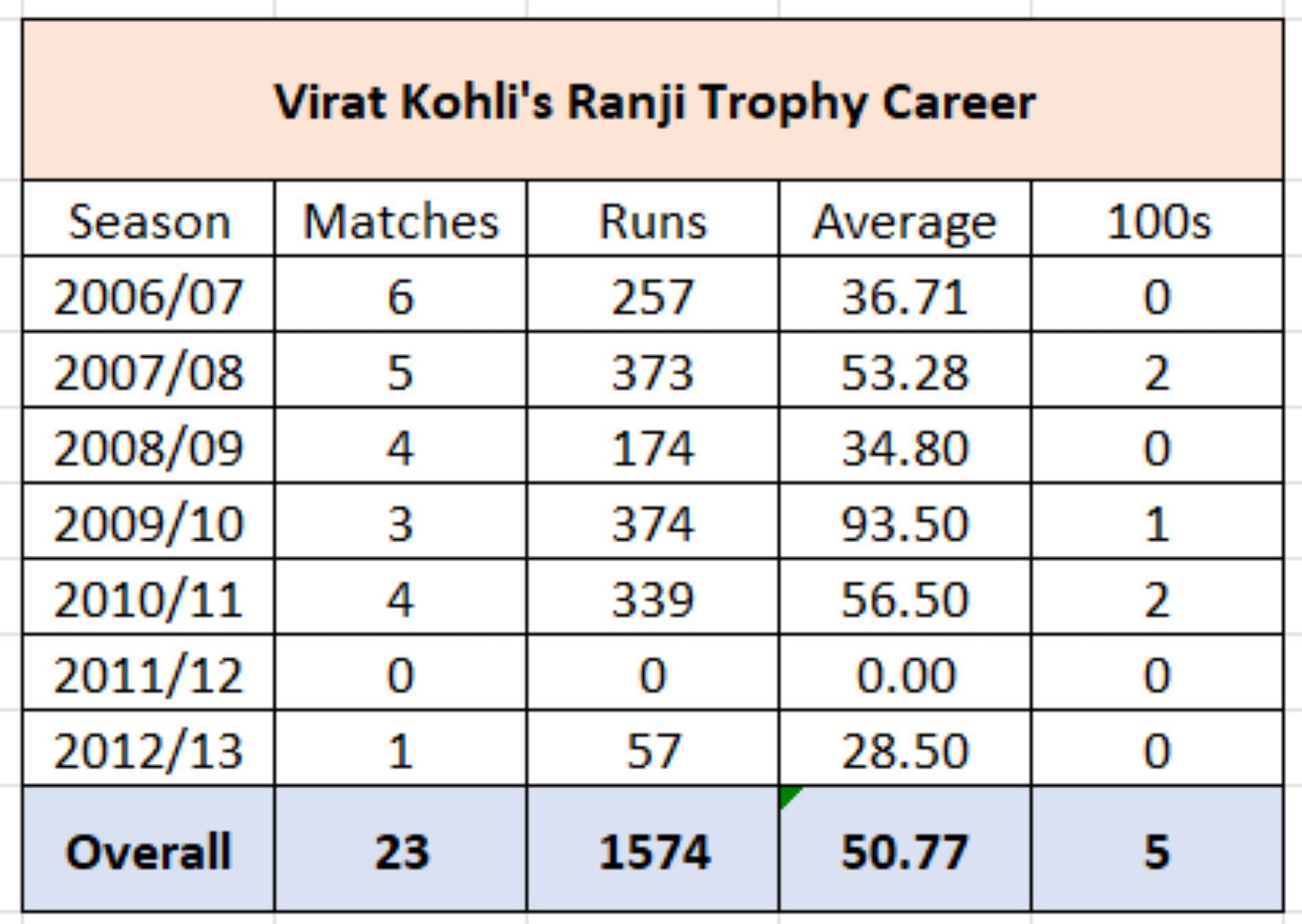 The runs continued to flow in the following 2010-11 tournament, with Kohli finishing on 339 runs at an average of 56.50, including two centuries in four games. While he skipped the 2011-12 campaign after becoming an all-format player for India, Kohli played a lone game in the 2012-13 Ranji Trophy, scoring 57 runs in the two innings.