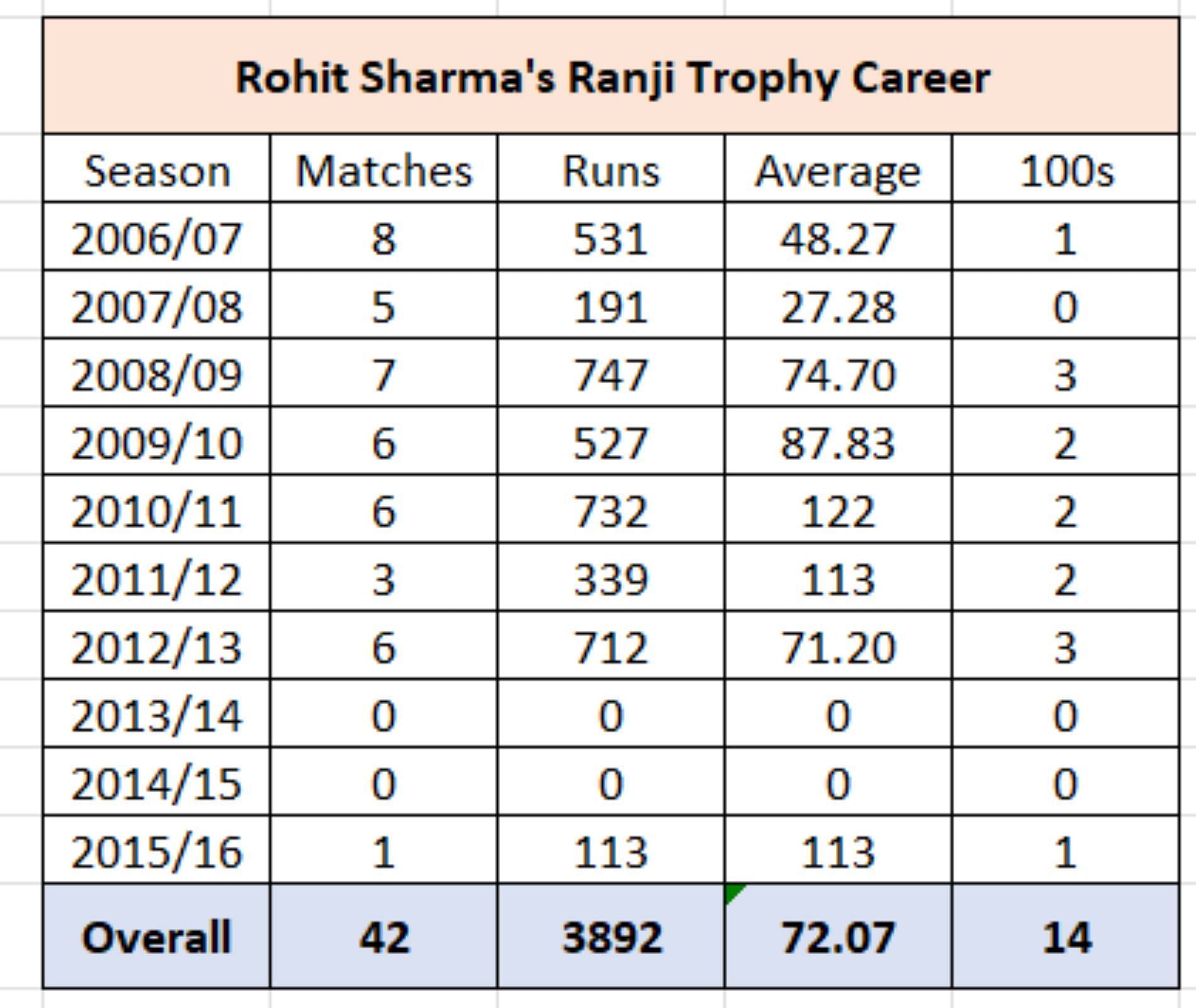 Here is a tabular summary of Rohit Sharma's Ranji Trophy career: