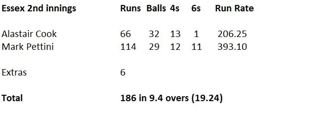 But then, something weird happened. Essex scored 186 runs in the 2nd innings off just 9.4 overs, at a run rate of 19.24!