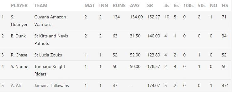 Australian star Ben Dunk is second on the list with 63 runs from two matches, including a fluent 21-ball 34 in a losing cause against the Barbados Tridents. Although Dunk did not look at his best against the Warriors, his dynamic batting in the middle order will be key for the Patriots this season.