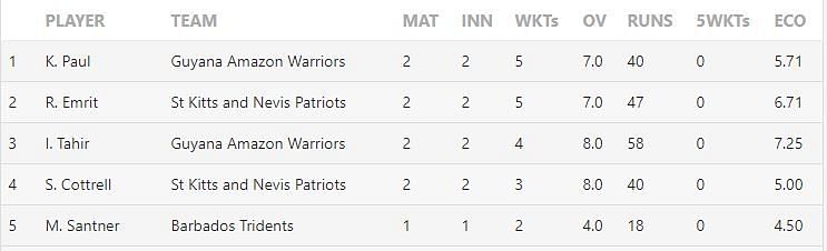 Imran Tahir's name in the top five wicket-takers' list is hardly a surprise given the veteran's bag of tricks in the shortest format, and with four wickets from two matches, the South African is third on the list.