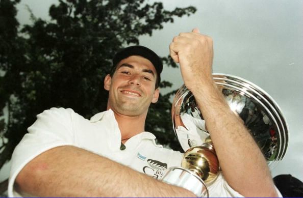 Stephen Fleming the captain of New Zealand keeps a tight grip on the trophy after beating India after the India v New Zealand Final of the ICC Knockout Tournament in 2000.