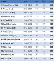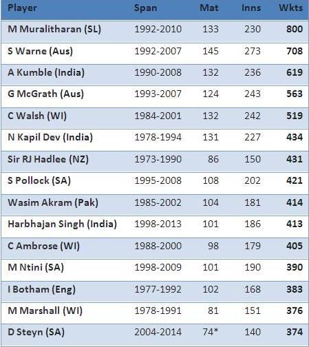 Former Sri Lankan off-spinner Muttiah Muralitharan heads the list with 800 international Test wickets, followed by Shane Warne (708 wickets) of Australia and Anil Kumble (619 wickets) of India.