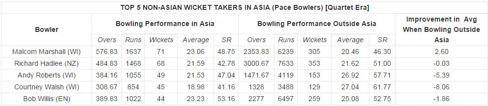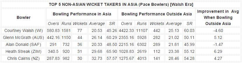 As we moved towards the 90s, and with the onset of the Walsh Era, we saw that the non-Asian fast bowlers started to struggle in subcontinental conditions. This could very well be attributed to the lack of express pace that those in the 70s and 80s had that allowed the extra something off the pitch, in unhelpful conditions.