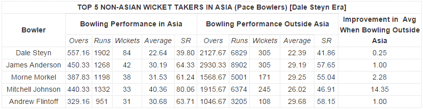 Unlike all the names that we observed here, across 40 years, barring Hadlee, not a single one had the attribute of being as good in Asian countries as in non-Asian ones. Steyn not only is comfortably ahead in terms of average but is phenomenally better than the 2nd best when it comes to wickets and the number of balls he takes to take them. Someone like Johnson, who is often heralded as the next biggest fast-bowling threat after the quartet, fares poorly in the subcontinent.