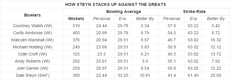 It’s fair to say that Steyn’s potency in all kinds of conditions and against all opposition (shown by the consistency in average), puts him ahead of many of the West Indies bowling greats, barring Marshall maybe, who always favoured one condition or kind of opposition, over others.