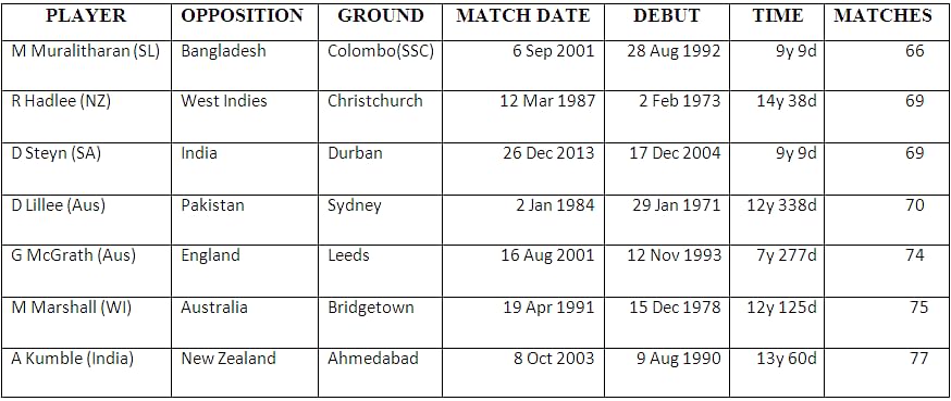 Richard Hadlee get to this landmark, 14 years and 38 days after he made his debut. Hadlee took the 350th test wicket on the test match started on 12th march 1987 against West Indies at Christchurch. And Dale Steyn get to this landmark, 9 years and 9 days after he made his debut. Steyn took the 350th test wicket on the test match started on 26th december 2013 against India at Durban.