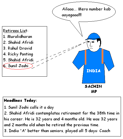 For all critics and fans alike, here is a piece of news that you did not know. Sachin tried an Afridi, albeit unsuccessfully. Several times over the last one and half years, he has tried to retire, but never did people let him go. Here’s unveiling the truth, with excerpts from Sachin’s diary (stolen when his hands were tied during a hair-styling session).