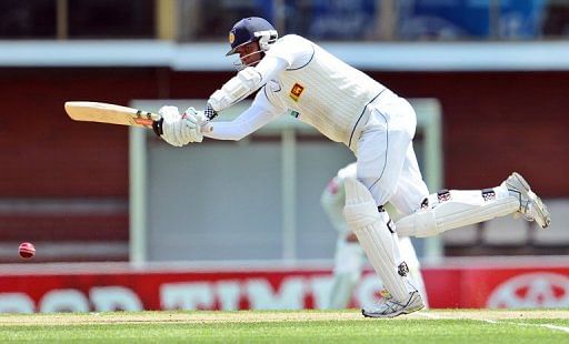Sri Lanka’s Angelo Mathews bats on the third day of the first Test in Hobart on December 16, 2012. Mathews and Tillakaratne Dilshan shared in a record partnership as they frustrated Australia’s bowlers in the first Hobart Test on Sunday.