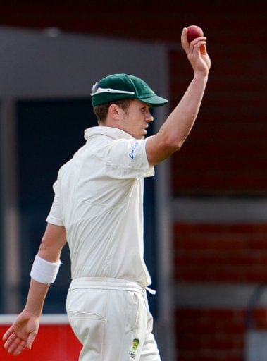 Australia’s paceman Peter Siddle raises the ball after taking five Sri Lankan wickets on the third day of their first cricket Test match in Hobart, on December 16, 2012.
