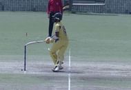 Just as he was getting back to a normal position, he ended up knocking his bails off.