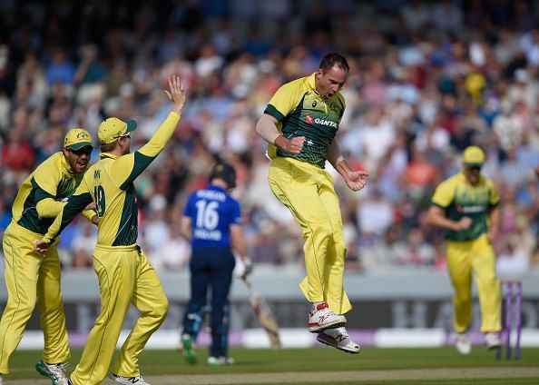 The home team never recovered from the twin blows of early wickets and losing their in-form captain, and their innings only went downhill from there on. Ben Stokes (42 off 51) was the only batsman to provide any resistance to the Aussies, and for a while seemed to find an able partner in No.9 Adil Rashid – before being himself dismissed by Mitchell Marsh.
