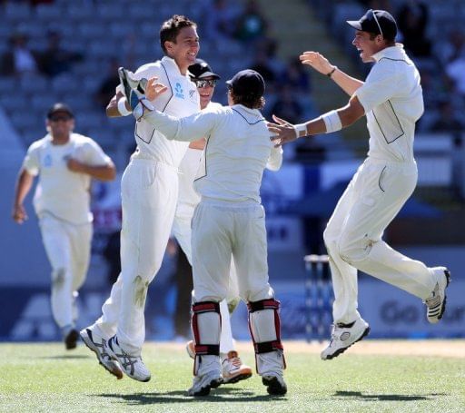 New Zealand’s Trent Boult (2nd L) celebrates with teammates during day five of the Test against England on March 26, 2013. Boult and Neil Wagner proved a handful for England’s batsmen in New Zealand.