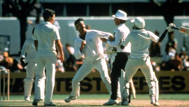 Javed Miandad's wrestling with Dennis Lillee in the middle of the pitch in 1981