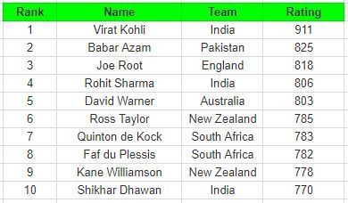 Indian batsmen Virat Kohli, Rohit Sharma and Shikhar Dhawan hold on to their respective places in the latest ICC ODI batsmen's rankings. Skipper Kohli continues to be on top of the rankings chart with 911 points, which is also the highest rating points in his ODI career. His deputy Rohit Sharma stays at fourth with 806 points while his opening partner Shikhar Dhawan is in the tenth place with 770 points.