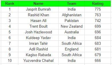 There is no change in the top-15 of the bowlers' rankings which is led by Indian pacer Jasprit Bumrah. India also has Kuldeep Yadav (sixth) Yuzvendra Chahal (tenth) and Axar Patel (15th) in the top-15.