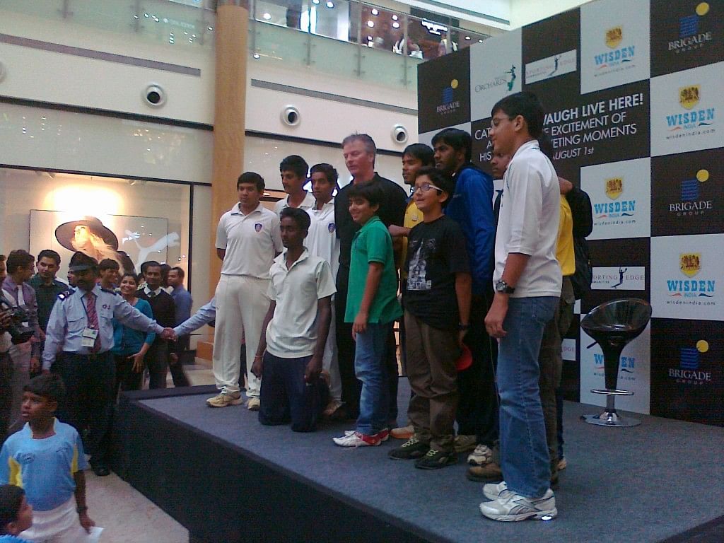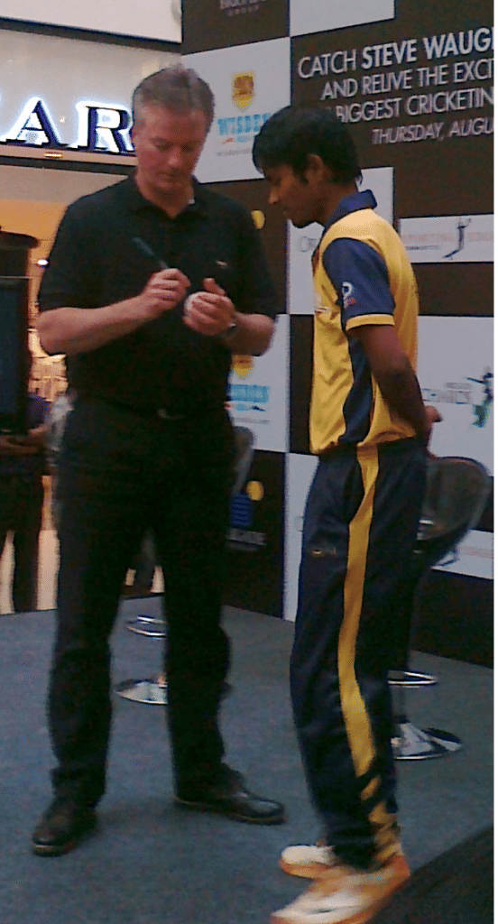 Waugh then went on to interact with some young players from various cricket academies in Bangalore. He autographed cricket balls, and copies of his autobiography “Out of My Comfort Zone”. He patiently listened to his fans, and was particularly amused when a lady revealed that she had met her husband on a Steve Waugh fan club website.