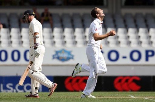 England’s Steven Finn (R) celebrates the wicket of New Zealand’s Peter Fulton for 136 during day two of their 3rd Test match, at Eden Park in Auckland, on March 23, 2013.