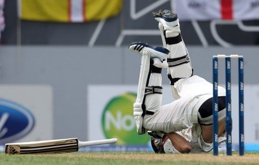 New Zealand’s Tim Southee rolls over after making a run during day two of their 3rd Test match against England, at Eden Park in Auckland, on March 23, 2013.