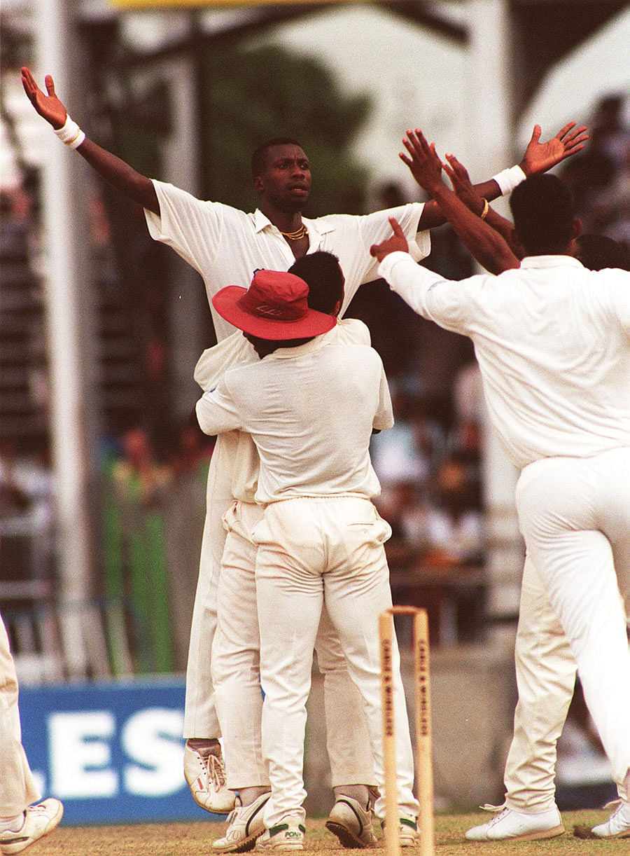 England were already leading the five match Test series by 1-0. In the fourth Test match, towards the end of day 4, England came out to bat, there were good chances that the English would either maintain or even exceed their lead. But Ambrose took the charge and picked up 2 wickets to leave England 19 for three at the end of the day. But still two wicket keepers Stewart and Russel on day four started very well and denied all chances to their opponets, and then just at the right moment Ambrose broke the partnership and thereafter blew away the English batting line up. He had his career best figures of 8 for 45 to help his team win the match.