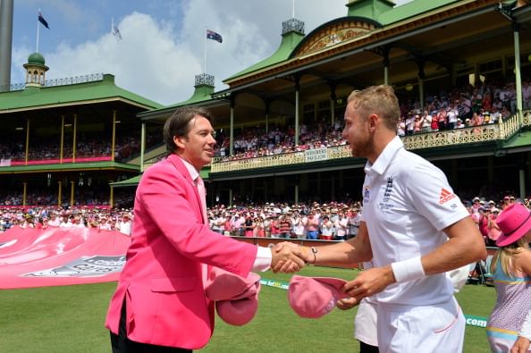 England cricketer Stuart Broad hands over a pink cap to former Australian cricketer Glenn McGrath (L) during a charity ceremony prior to the third day of the fifth Ashes cricket Test against Australia at the Sydney Cricket Ground on January 5, 2014.