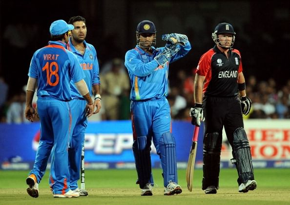 During the 2011 WC match in Bangalore, England's Ian Bell was adjudged not out by umpire Billy Bowden after India's Yuvraj Singh appeal for lbw. Yuvraj and Dhoni referred it to the third umpire where replays suggested that Bell had been struck in line and the ball was going on to hit the stumps. However as he was 2.5 metres down the pitch and was declared not out. The match ended in a tie, with Dhoni voicing his displeasure at the decision.