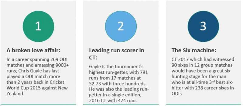 Chris Gayle was not only missed as the tournament's leading highest run-getter but also for the swag and power-hitting he brings to the table. Played in immensely batting friendly conditions, this CT would have been a great platform for the likes of Gayle to charm his fans with his giant hits and free-flowing batting.