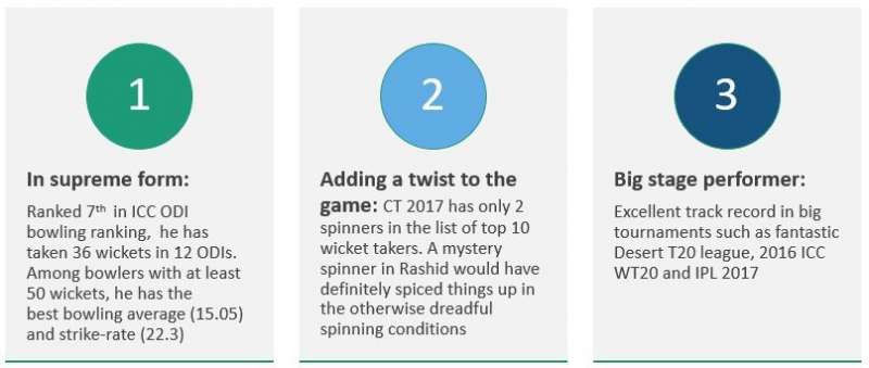 For the devoted fans of the game, it was a fantastic opportunity missed not having this young leg spinner on such a big platform as the Champions Trophy. Coming from an associate nation and having made his ODI debut aged 17, Rashid Khan has moved strength to strength and tricked some of the world’s best batters with his spin.