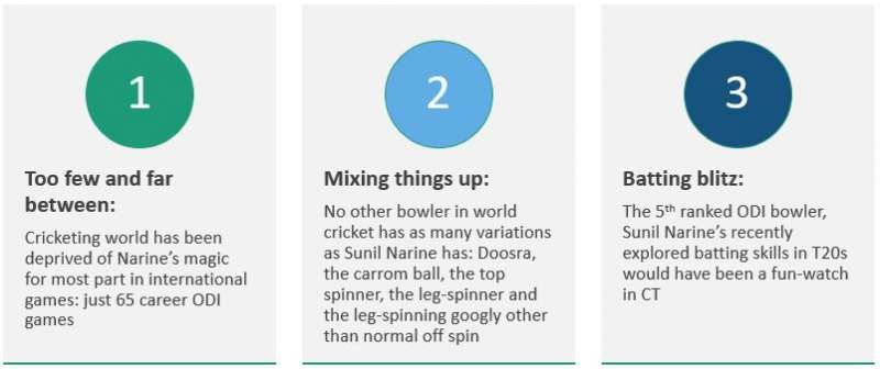 Another West Indian, Sunil Narine’s presence would have markedly made a difference to this edition of CT not only because it has grossly been a batsman dominated affair but also for his recently discovered batting firepower.