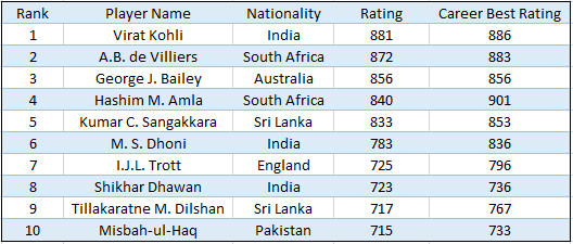 Virat Kohli, the Indian vice-captain, has taken the first spot in the ICC ODI rankings for batsmen, usurping South African captain AB de Villiers. Kohli is currently on 881 points, 9 points clear of De Villiers. Australian batsman George Bailey is at the third position with a career best rating of 856.