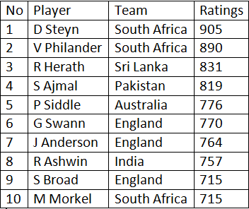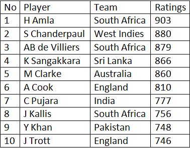 Hashim Amla (903) and Dale Steyn (905) lead the batting and bowling charts respectively.