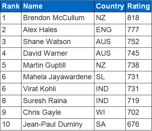 New Zealand wicket-keeper Brendon McCullum leads the T20 batting list with 818 points, followed by Alex Hales of England and Australia’s Shane Watson.