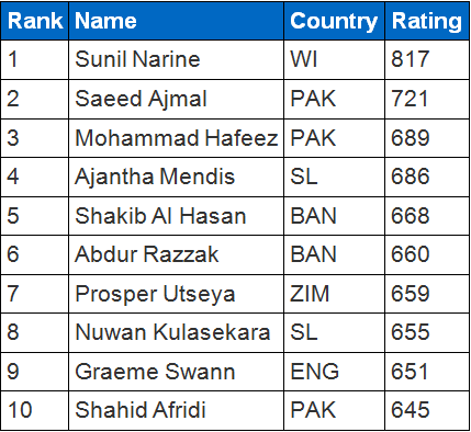Sunil Narine of West Indies leads the bowlers’ table with 817 points followed by Pakistan’s Saeed Ajmal, who is on 721 points, and his countrymen Mohammad Hafeez – 689 points.
