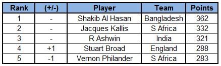 Among the all-rounders, Bangladesh’s Shakib Al Hasan stays at the top with 362 points. Ashwin, Broad and Philander also make it to this list having impressed with the bat as well.