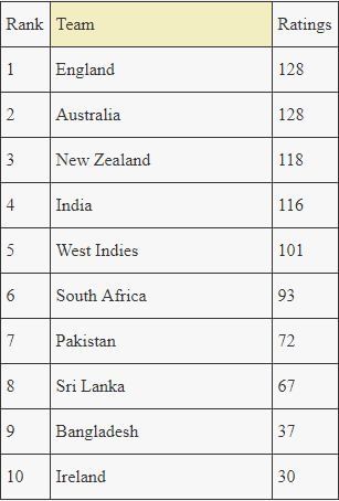 England leapfrogged Australia after the results from 2013-14 and 2014-15 were considered at 50% weightage and those from 2015-16 were considered at 100% weightage in the annual rankings update. England, who travel to Australia this year-end for the Ashes tour, started the year with 125 ranking points, three points behind Australia.