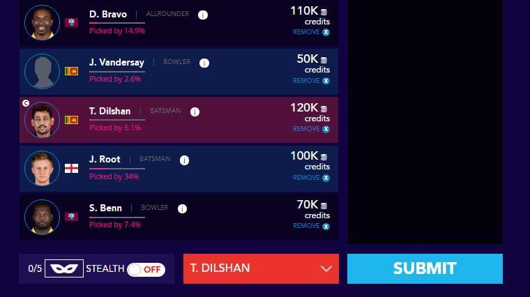 Joe Root, Jos Buttler, Adil Rashid, Tillakaratne Dilshan, Jeffrey Vandersay and Dushmantha Chameera – These 6 players would be my top picks for the game. Since I can’t get all of them into my team for obvious reasons, I will have to resort to elimination process.