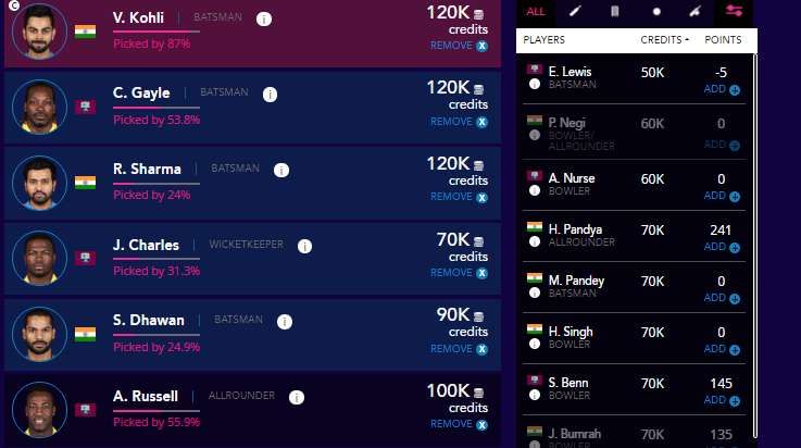 Now, coming to this match, with Andre Russell, Dwayne Bravo and Jasprit Bumrah already in my team, the other players who interest me are Virat Kohli, Chris Gayle, Rohit Sharma, Shikhar Dhawan and Hardik Pandya. I am going by what I have seen so far, which is Mumbai being an absolute road. It should be the same today as well, unless India doctor the pitch again.
