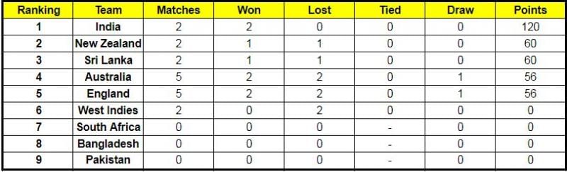 India continue to lead the standings with 120 points in 2 matches followed by New Zealand and Sri Lanka who have 60 points each. Since the Ashes series ended in a draw, both Australia and England earned the same number of points (56) from the series.