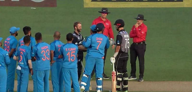 Third umpire Shaun Haig, after going through the set of replays, decided to stay with the on-field pressed the 'OUT' button, much to the disbelief of Kane Williamson at the non-striker's end. He then joined an equally stunned Mitchell in the middle of the pitch, talking with the on-field umpires about the decision made.
