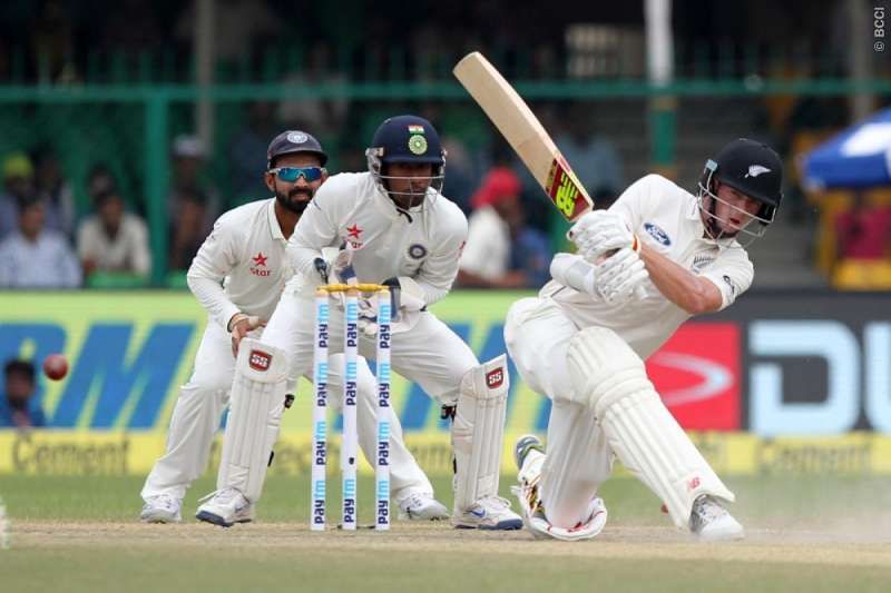 He put on 102 runs for the fifth wicket with Mitchell Santner, before falling to Ravindra Jadeja’s spin, for a 120-ball 80, that had 9 fours and a six.