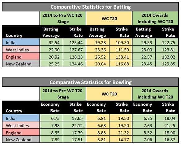 Just prior to the inaugural match of the T20 World Cup, I had performed some analysis on the performance of the players who are in the individual squads based on games played since 2014. I appended the performance in the tournament for the players from the four semi-finalist squads and calculated the composite statistics (see Chart A).