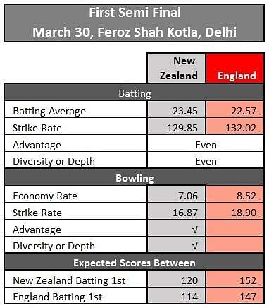 Based on the batting and bowling performances, let me analyze the relative advantages of the teams in the two semi-finals.