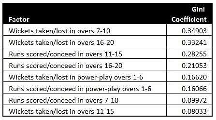 It is not surprising that wickets taken between overs 7 and 10 and between 15 and 20 have high predictive power for the same reason stated in the prior bullet point.
