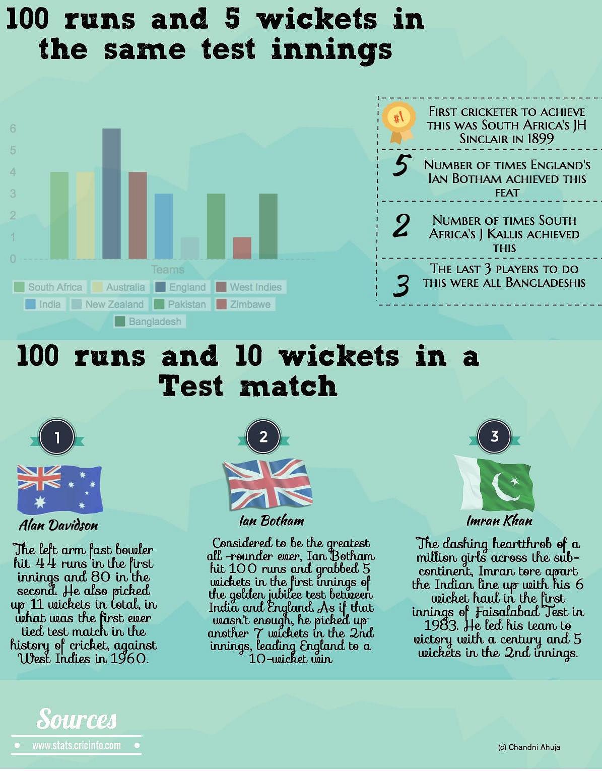 Good all-rounders are the biggest asset to their teams, and the decade of 1980s saw the best all-rounders the game has ever witnessed – Ian Botham, Kapil Dev and Imran Khan. While it’s difficult to streamline the greatness of these legends into numerical stats, very few players have been lucky enough to have the illustrious record of a century and 5-for in the same innings.