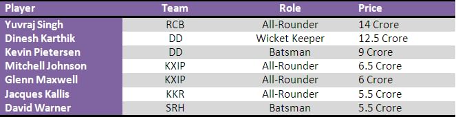 After the mentioned 7 players in the list (shown below), there is a number of players in the 8th position with the same price tag of 5 Crores each. They are Robin Uthappa for KKR, Murali Vijay for DD, Mitchell Start for Royal Challengers Bangalore and Michael Hussey for Mumbai Indians.