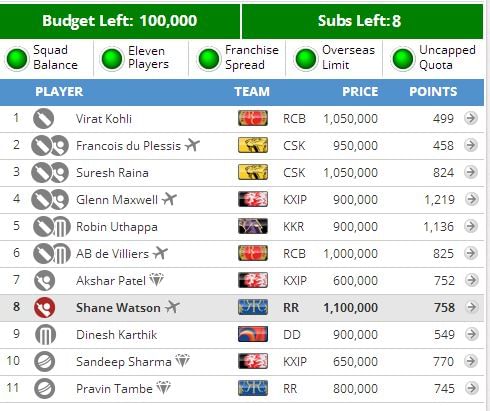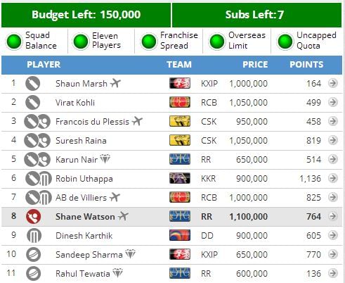 Shane Watson should bowl on these decks, and hence it is a no-brainer to have him in. Rahane is at best a 125-point return player. I don’t want to waste a transfer on him at this stage of the game, although I expect him to be amongst points. The primary reason for this being I can’t carry him along till the last match, and he isn’t worth coming in at the cost of two transfers.