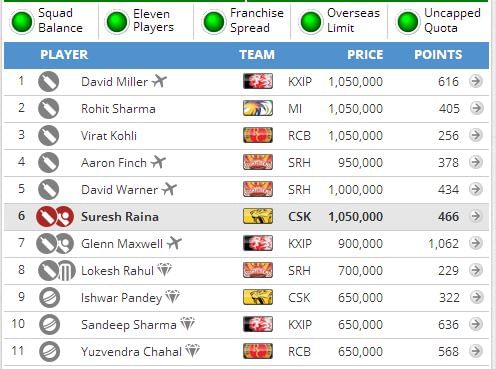 With Rajasthan Royals playing 2 matches in a 3-match round, getting in Ajinkya Rahane and Shane Watson into the team is a no-brainer. James Faulkner is another entry that interests me. Faulkner looks like he has found his lost touch back and is mainly employed at the death, which more often than not translates to wickets. However, I choose to keep him out, as he is up against some of the finest hitters that the IPL has ever seen in Dhoni, McCullum, Smith, Raina, Gayle, De Villiers and Kohli.
