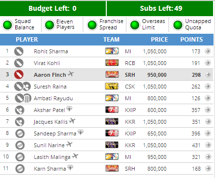 I have already got Rohit Sharma, Aaron Finch and Ambati Rayudu for this game.