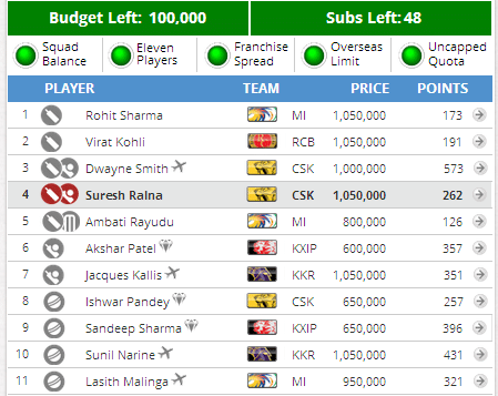On the other hand, Lasith Malinga against Sunrisers Hyderabad (weak middle order) and Kings X1 Punjab (an uncertain top 3 and a clueless tail order) doesn’t take too much thinking. So Malinga, after being out of my team for the last couple of fixtures (one came off very well, while a brain fade from Dinesh Karthik messed up the other to an extent), finds his spot again in my team.