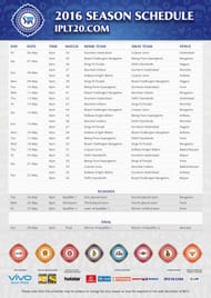DateMatchVenueTime (IST)LIVE Score/ Results09/04/2016Mumbai Indians vs Rising Pune SupergiantsWankhede Stadium, Mumbai20:00Scorecard10/04/2016Kolkata Knight Riders vsDelhi DaredevilsEden Gardens, Kolkata20:00Scorecard11/04/2016Kings XI Punjab vs Gujarat LionsPunjab Cricket Association Stadium, Mohali20:00Scorecard12/04/2016Royal Challengers Bangalorevs Sunrisers Hyderabad.M. Chinnaswamy Stadium, Bengaluru20:00Scorecard13/04/2016Kolkata Knight Riders vs Mumbai IndiansEden Gardens, Kolkata20:00 14/04/2016Gujarat Lions vs Rising Pune SupergiantsSaurashtra Cricket Association Stadium, Rajkot20:00 15/04/2016Delhi Daredevils vs Kings XI PunjabFerozeshah Kotla, Delhi20:00 16/04/2016Sunrisers Hyderabad vs Kolkata Knight RidersRajiv Gandhi International Cricket Stadium, Hyderabad16:00 16/04/2016Mumbai Indians vs Gujarat LionsWankhede Stadium, Mumbai20:00 17/04/2016Kings XI vs Rising Pune SupergiantsPunjab Cricket Association Stadium, Mohali16:00 17/04/2016Royal Challengers Bangalore vs Delhi DaredevilsM. Chinnaswamy Stadium, Bengaluru20:00 18/04/2016Sunrisers Hyderabad Vs Mumbai IndiansRajiv Gandhi International Cricket Stadium, Hyderabad20:00 19/04/2016Kings XI Punjab vs Kolkata Knight RidersPunjab Cricket Association Stadium, Mohali20:00 20/04/2016Mumbai Indians vs Royal Challengers BangaloreWankhede Stadium, Mumbai20:00 21/04/2016Gujarat Lions vs Sunrisers HyderabadSaurashtra Cricket Association Stadium, Rajkot20:00 22/04/2016Rising Pune Supergiants vs Royal Challengers Bangalore.MCA International Stadium, Pune20:00 23/04/2016Delhi Daredevils vs Mumbai IndiansFerozeshah Kotla, Delhi16:00 23/04/2016Sunrisers Hyderabad vs Kings XI PunjabRajiv Gandhi International Cricket Stadium, Hyderabad20:00 24/04/2016Gujarat Lions vs Royal Challengers BangaloreSaurashtra Cricket Association Stadium, Rajkot16:00 24/04/2016Rising Pune Supergiants vs Kolkata Knight Riders.MCA International Stadium, Pune20:00 25/04/2016Kings XI vs Mumbai IndiansPunjab Cricket Association Stadium, Mohali20:00 26/04/2016Sunrisers Hyderabad vs Rising Pune SupergiantsRajiv Gandhi International Cricket Stadium, Hyderabad20:00 27/04/2016Delhi Daredevils Vs Gujarat LionsFerozeshah Kotla, Delhi20:00 28/04/2016Mumbai Indians vs Kolkata Knight RidersWankhede Stadium, Mumbai20:00 29/04/2016Rising Pune Supergiants vs Gujarat Lions.MCA International Stadium, Pune20:00 30/04/2016Delhi Daredevils vs Kolkata Knight RidersFerozeshah Kotla, Delhi16:00 30/04/2016Sunrisers Hyderabad vs Royal Challengers BangaloreRajiv Gandhi International Cricket Stadium, Hyderabad20:00 01/05/2016Gujarat Lions vs Kings XI PunjabSaurashtra Cricket Association Stadium, Rajkot16:00 01/05/2016Rising Pune Supergiants vs Mumbai Indians.MCA International Stadium, Pune20:00 02/05/2016Royal Challengers Bangalore vs Kolkata Knight Riders.M. Chinnaswamy Stadium, Bengaluru20:00 03/05/2016Gujarat Lions vs Delhi DaredevilsSaurashtra Cricket Association Stadium, Rajkot20:00 04/05/2016Kolkata Knight Riders vs Kings XI PunjabEden Gardens, Kolkata20:00 05/05/2016Delhi Daredevils vs Rising Pune SupergiantsFerozeshah Kotla, Delhi20:00 06/05/2016Sunrisers Hyderabad vs Gujarat LionsRajiv Gandhi International Cricket Stadium, Hyderabad20:00 07/05/2016Royal Challengers Bangalore vs Rising Pune Supergiants.M. Chinnaswamy Stadium, Bengaluru16:00 07/05/2016Kings XI Punjab VS Delhi DaredevilsVidarbha Cricket Association Stadium, Nagpur20:00 08/05/2016Mumbai Indians VS Sunrisers HyderabadWankhede Stadium, Mumbai16:00 08/05/2016Kolkata Knight Riders VS Gujarat LionsEden Gardens, Kolkata20:00 09/05/2016Kings XI Punjab VS Royal Challengers BangaloreVidarbha Cricket Association Stadium, Nagpur20:00 10/05/2016Rising Pune Supergiants VS Sunrisers HyderabadMCA International Stadium, Pune20:00 11/05/2016Royal Challengers Bangalore VS Mumbai IndiansM. Chinnaswamy Stadium, Bengaluru20:00 12/05/2016Sunrisers Hyderabad VS Delhi DaredevilsRajiv Gandhi International Cricket Stadium, Hyderabad16:00 13/05/2016Mumbai Indians VS Kings XI PunjabWankhede Stadium, Mumbai20:00 14/05/2016Royal Challengers Bangalore VS Gujarat LionsM. Chinnaswamy Stadium, Bengaluru16:00 14/05/2016Kolkata Knight Riders VS Rising Pune SupergiantsEden Gardens, Kolkata20:00 15/05/2016Mumbai Indians VS Delhi DaredevilsWankhede Stadium, Mumbai16:00 15/05/2016Kings XI Punjab VS Sunrisers HyderabadVidarbha Cricket Association Stadium, Nagpur20:00 16/05/2016Kolkata Knight Riders VS Royal Challengers BangaloreEden Gardens, Kolkata20:00 17/05/2016Rising Pune Supergiants VS Delhi DaredevilsMCA International Stadium, Pune20:00 18/05/2016Royal Challengers Bangalore VS Kings XI PunjabM. Chinnaswamy Stadium, Bengaluru20:00 19/05/2016Gujarat Lions VS Kolkata Knight RidersTBC, TBC20:00 20/05/2016Delhi Daredevils VS Sunrisers HyderabadShaheed Veer Narayan Singh International Cricket Stadium, Raipur20:00 21/05/2016Rising Pune Supergiants VS Kings XI PunjabEden Gardens, Kolkata16:00 21/05/2016Gujarat Lions VS Mumbai IndiansTBC, TBC20:00 22/05/2016Kolkata Knight Riders VS Sunrisers HyderabadEden Gardens, Kolkata16:00 22/05/2016Delhi Daredevils vs Royal Challengers BangaloreShaheed Veer Narayan Singh International Cricket Stadium, Raipur20:00